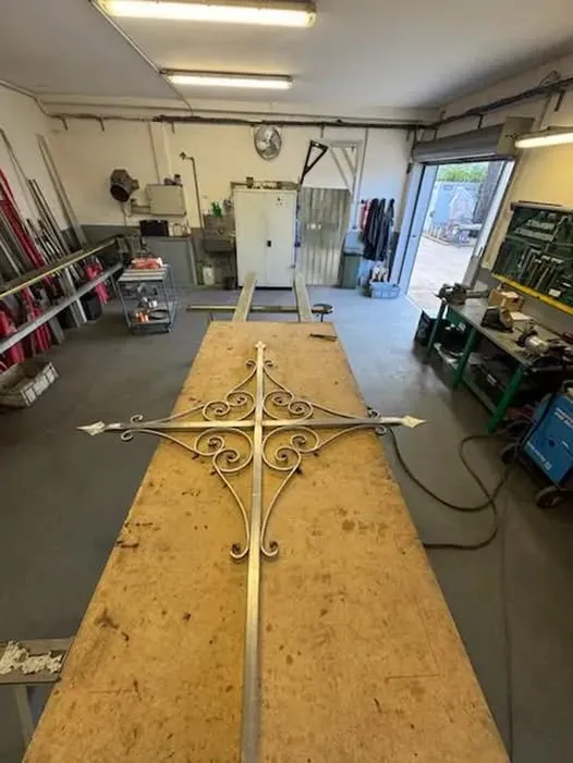 La croix du clocher, conçue en inox forgé, a été façonnée dans le respect des traditions métallurgiques tout en intégrant des procédés modernes. Son design élégant et équilibré reflète la finesse du travail du métal.