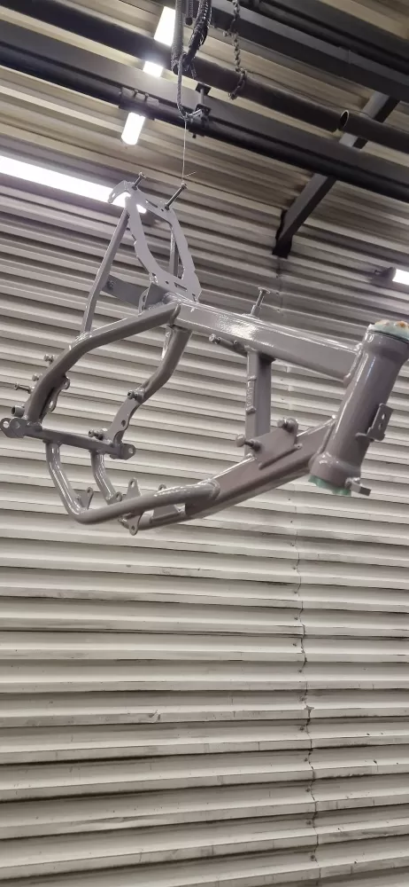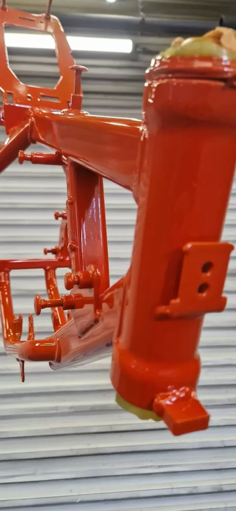 STM à effectué une rénovation d'un cadre de moto KTM. Sablage Sa3 + thermolaquage Tri couche qui comprend un apprêt époxy puis une finition polyester orange KTM et un vernis brillant.